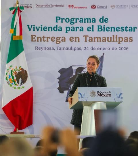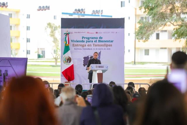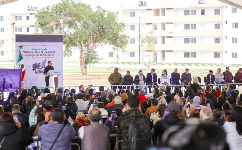 Reynosa, Tam.- “Me da mucho gusto estar hoy aquí en Reynosa, Tamaulipas, para entregar beneficios de los programas del Gobierno de la República. Agradezco la presencia del Gobernador Constitucional de Tamaulipas, Doctor Américo Villarreal Anaya, y del Presidente Municipal de Reynosa, Carlos Peña Ortiz”, dijo la Presidenta al encabezar la entrega de beneficios de programas federales, de Vivienda del Bienestar y Pensión para Mujeres Bienestar.