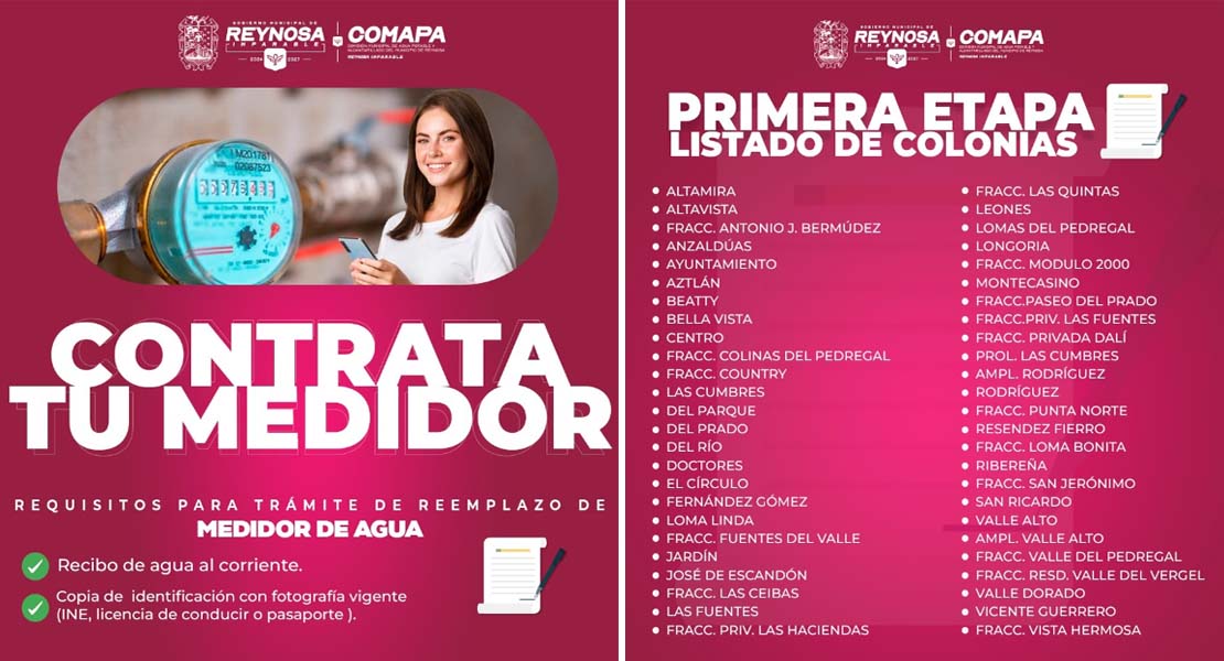 Reynosa, Tam.- La Comisión Municipal de Agua Potable y Alcantarillado de Reynosa informa que, a partir de febrero, se aplicará un consumo fijo de 25 metros cúbicos mensuales a los usuarios que no cuenten con medidor de agua o cuyo dispositivo no funcione, conforme a lo establecido en el contrato de servicios.