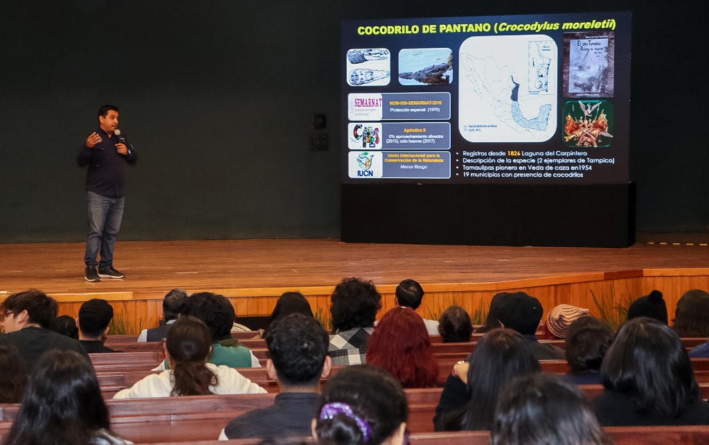 Tampico, Tam.- La Universidad Autónoma de Tamaulipas (UAT) llevó a cabo la conferencia “Problemática de las interacciones humano–cocodrilo en Tamaulipas: percepción del riesgo, conducta humana y comunicación social”, un espacio de reflexión académica que vinculó el conocimiento científico con los desafíos sociales y ambientales del entorno regional.