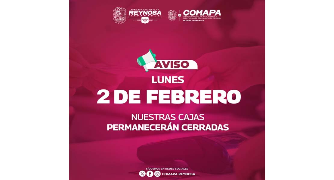 Reynosa, Tam.- La Comisión Municipal de Agua Potable y Alcantarillado de Reynosa informa a sus usuarios que este lunes 2 de febrero, todas las sucursales y cajas de atención permanecerán cerradas, en conmemoración por el Día de la Constitución.