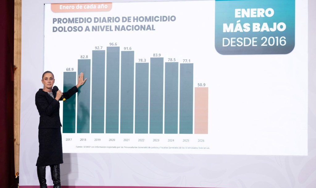 Agregó que, a nivel nacional, si se compara octubre de 2024, cuando se registraron 636.6 delitos de alto impacto en promedio diario, contra 441.3 que se registraron en enero de 2026, se tiene una reducción del 31 por ciento; destacando que enero de 2026 es el mes más bajo, también, de los últimos 17 meses.