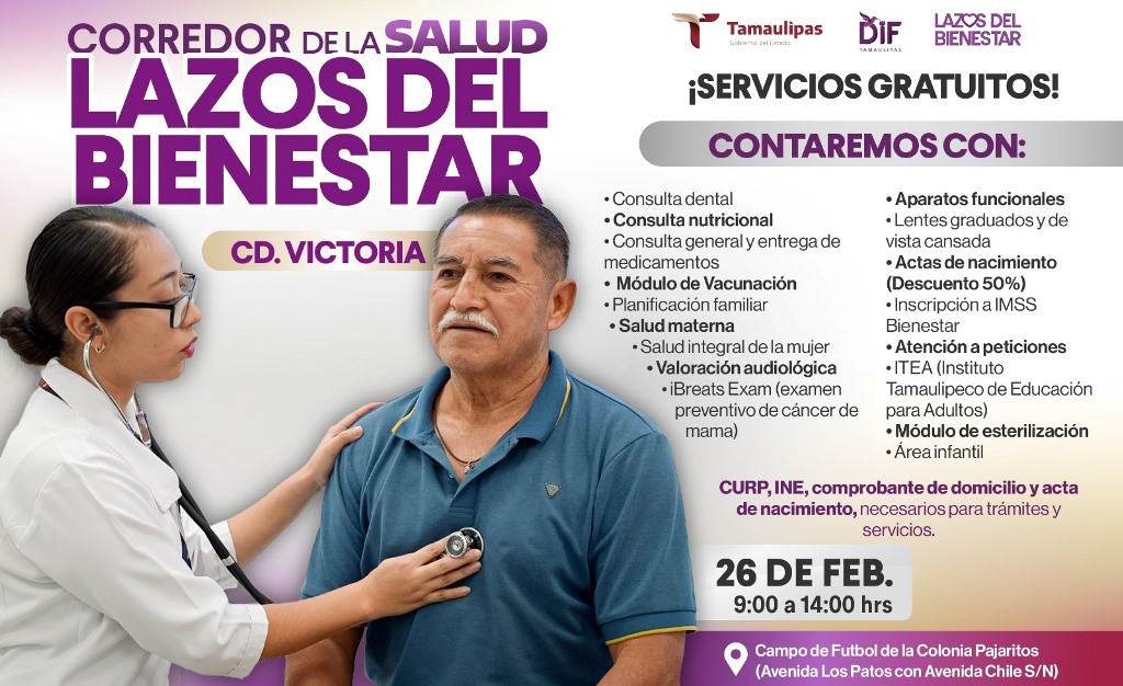 El primer Corredor de la Salud se lleva a cabo este miércoles 11 de febrero en Ciudad Victoria, en un horario de 9:00 a 14:00 horas, en el campo de fútbol de la colonia Echeverría, ubicado en las calles Río Álamo y Cerro Azul, a un costado del CEDIF 07.