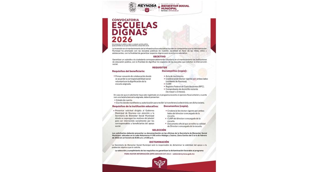 Recepción de documentos de las instituciones educativas en: Secretaría de Bienestar Social Municipal. Consulte fechas y requisitos en la convocatoria o pida más información al teléfono 8996893429 Extensión 4313; puede solicitarla también por correo electrónico: sebien@reynosa.gob.mx