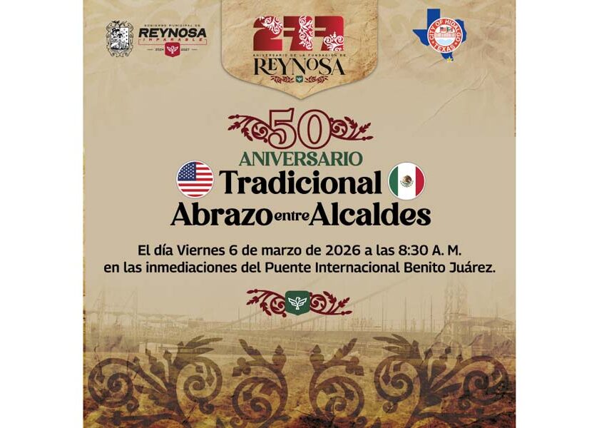 Reynosa, Tam.- El Presidente Municipal de nuestra ciudad, Carlos Peña Ortiz, protagonizará el Tradicional Abrazo binacional con su homólogo el Mayor de Hidalgo, Texas, Sergio Coronado, en los 50 Años de esta celebración que estará enmarcada en la conmemoración del 277 Aniversario de la Fundación de Reynosa. El viernes 6 de marzo será celebrado el Tradicional Abrazo, en las inmediaciones…