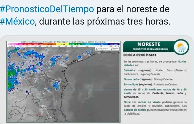 DE acuerdo con el Servicio Meteorológico Nacional, el sistema interactúa con una línea seca en Coahuila y un canal de baja presión, lo que generará descargas eléctricas, rachas de viento de 50 a 70 km/h y condiciones para torbellinos o tornados en Tamaulipas, Coahuila y Nuevo León.