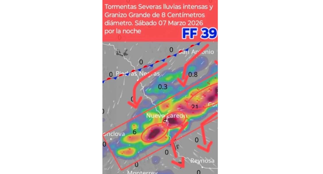 7 de marzo de 2026.EL frente frío número 39 provocará tormentas severas, lluvias intensas y posible caída de granizo de hasta 8 centímetros de diámetro durante la noche de este sábado en el noreste del país.