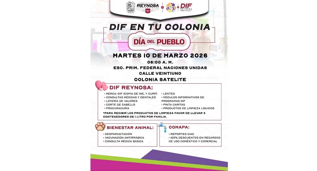 Reynosa, Tam.- Con el objetivo de acercar servicios y programas a la ciudadanía, el Sistema DIF-Reynosa que preside Carlos Luis Peña Garza, realizará la Brigada “DIF en tu Colonia” el próximo martes 10 de marzo a las 08:00 de la mañana, en la Escuela Primaria Federal Naciones Unidas, ubicada en calle 21 de la colonia Satélite.