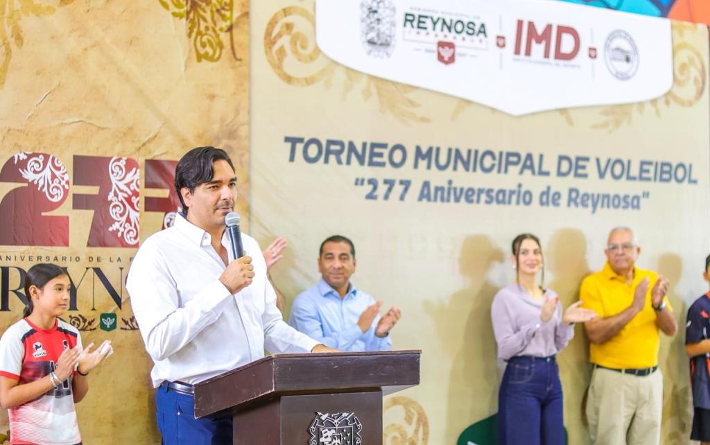 Reynosa, Tam.- El Torneo Municipal de Voleibol número 143, titulado “277 Aniversario de la Fundación de Reynosa” fue inaugurado por el Alcalde Carlos Peña Ortiz, acompañado por su esposa la Presidenta del Voluntariado DIF, Alejandra Yelitza Garza, en el Polideportivo, este sábado 7 de marzo en que también entregaron las medallas que premian el torneo anterior.