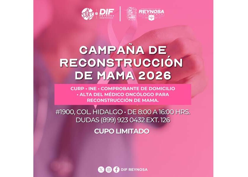 Reynosa, Tam.- El Sistema DIF-Reynosa que preside Carlos Luis Peña Garza, mantiene abierta la Campaña de Reconstrucción de Mama 2026, con el objetivo de contribuir al bienestar integral, mejorar la autoestima, seguridad y calidad de vida de las mujeres. Se hace un llamado a las mujeres que han superado el cáncer de mama a registrarse en las instalaciones del DIF…