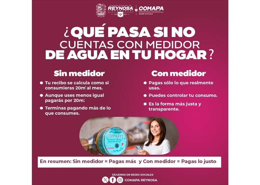 Reynosa, Tam.- La Comisión Municipal de Agua Potable y Alcantarillado de Reynosa invita a la ciudadanía a contar con medidor en sus hogares, ya que este dispositivo permite realizar un cobro justo, basado en el consumo real de agua, además de fomentar un uso más responsable del recurso. Al no contar con medidor, el servicio se cobra de manera estimada,…