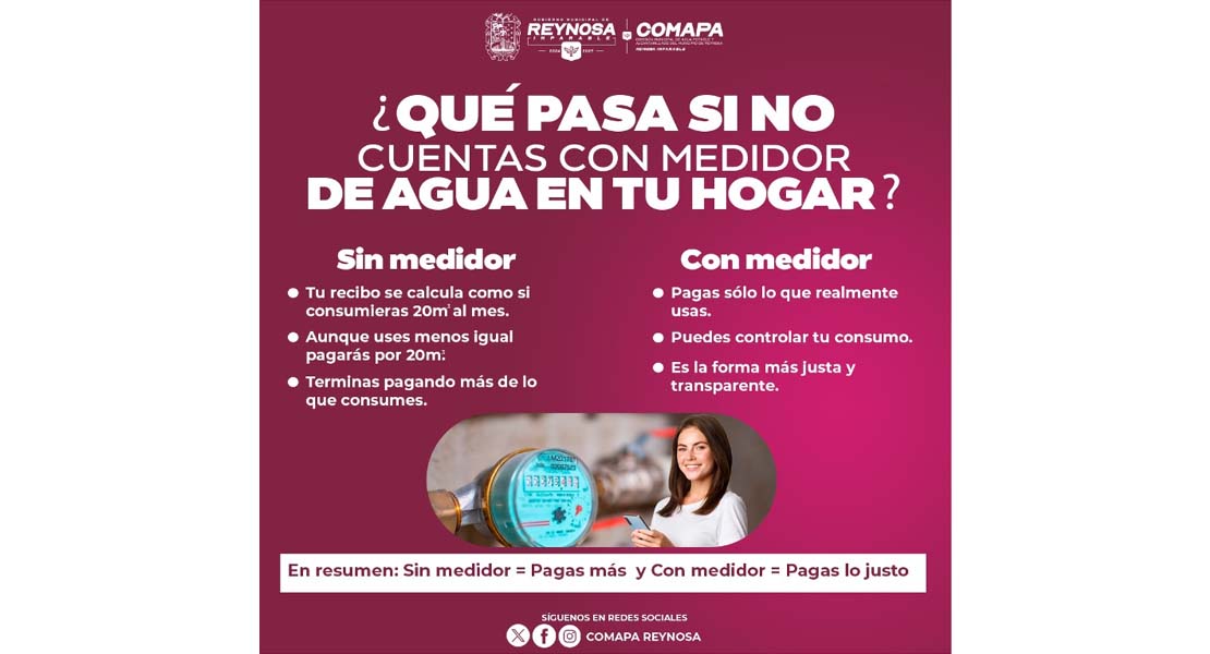 Reynosa, Tam.- La Comisión Municipal de Agua Potable y Alcantarillado de Reynosa invita a la ciudadanía a contar con medidor en sus hogares, ya que este dispositivo permite realizar un cobro justo, basado en el consumo real de agua, además de fomentar un uso más responsable del recurso.