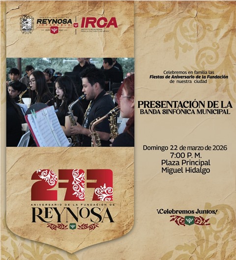 Reynosa, Tam.- El Gobierno de Reynosa, que preside el Alcalde Carlos Peña Ortiz, invita a disfrutar de la cartelera de eventos que ha organizado el Instituto Reynosense para la Cultura y las Artes con motivo del 277 Aniversario de la Fundación de nuestra ciudad.