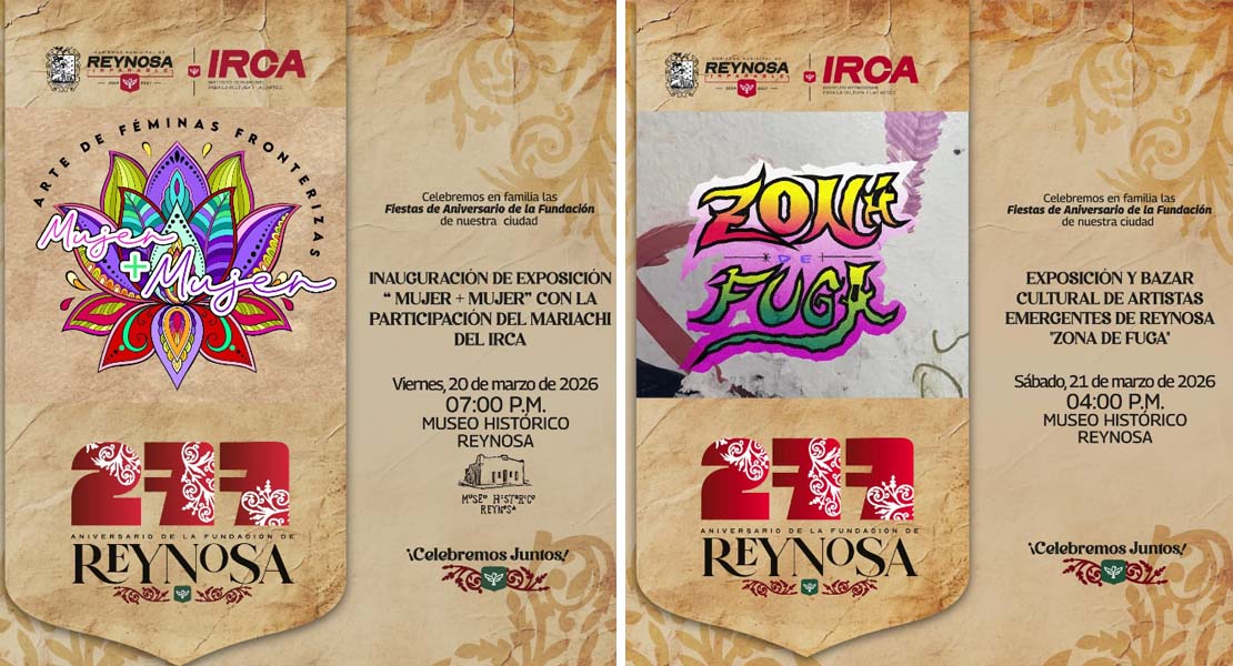 La celebración dará inicio este viernes 20 de marzo a las 7:00 P. M. en el Museo Histórico Reynosa con la inauguración de la exposición “Mujer + Mujer”, con una intervención especial del Mariachi del IRCA.