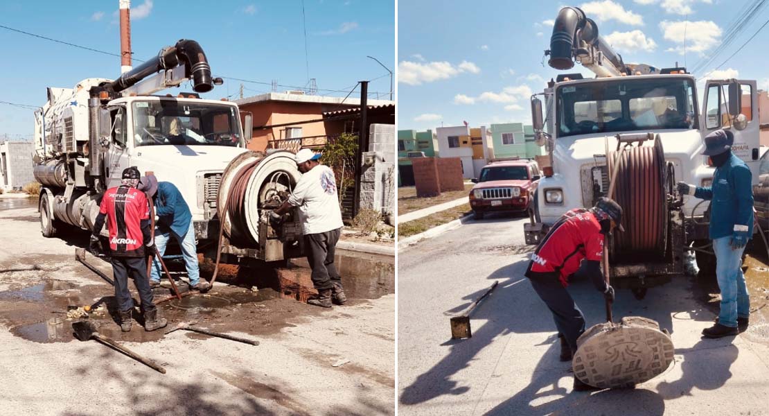 Reynosa, Tam.- Atendiendo las indicaciones del alcalde, Carlos Peña Ortiz, la Comisión Municipal de Agua Potable y Alcantarillado de Reynosa llevó a cabo maniobras de sondeo de línea general de drenaje sanitario y limpieza de pozos de visita en calles del fraccionamiento Los Almendros, con el objetivo de mantener bajos los niveles en la red y prevenir encharcamientos y derrames de aguas residuales en el sector.