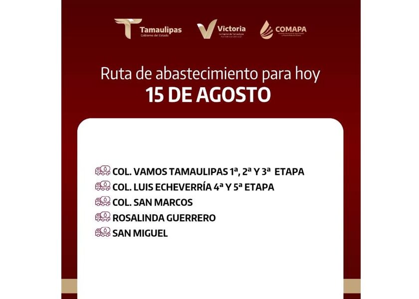 📍Col. Vamos Tamaulipas 1ª 2ª y 3ª Etapa📍Col. Luis Echeverría 4ª y 5ª Etapa📍Col. San Marcos📍Rosalinda Guerrero📍San Miguel 💧 ¡Juntos hacemos que el agua llegue a todos! Comparte esta información con tus vecinos.