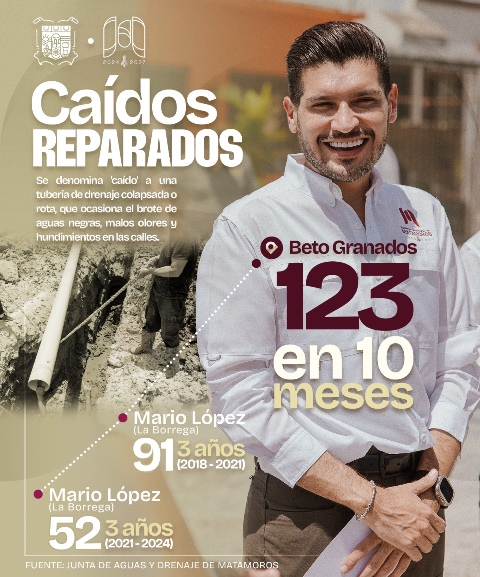Matamoros, Tam.- En tan solo 10 meses de gestión como alcalde de Matamoros, Beto Granados ha demostrado con hechos y números que la eficacia y el compromiso real con la ciudadanía son posibles. Con un total de 123 caídos rehabilitados entre 2024 y 2025, Beto Granados supera ampliamente los resultados de 2 administraciones anteriores. Para ponerlo en perspectiva, el exalcalde…