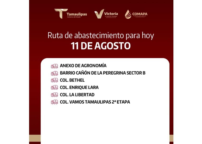 En COMAPA Victoria trabajamos para que el agua llegue a cada rincón de la ciudad. Este día, el servicio de abastecimiento se realiza en: