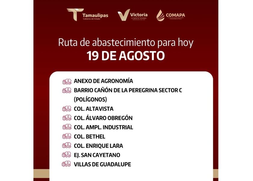 En COMAPA Victoria trabajamos para que el agua llegue a cada rincón de la ciudad. Este día, el servicio de abastecimiento se realiza en:
