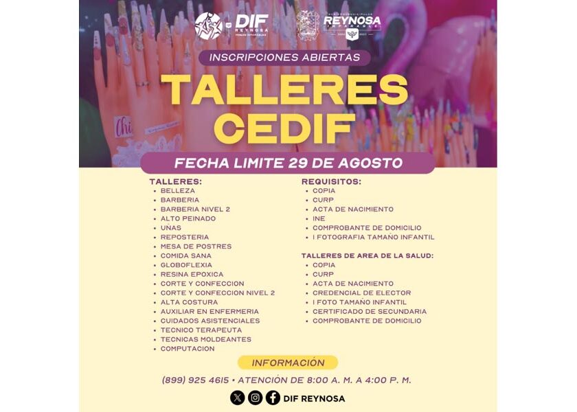 Reynosa, Tam.- El Sistema DIF Reynosa, que encabeza Carlos Luis Peña Garza, informa a la ciudadanía que se encuentran abiertas las inscripciones a los 18 talleres CEDIF, los cuales ofrecen a jóvenes y adultos la oportunidad de desarrollar habilidades en distintos oficios y actividades formativas. Se ofrece una amplia variedad de talleres que incluyen belleza, barbería, barbería nivel 2, alto…