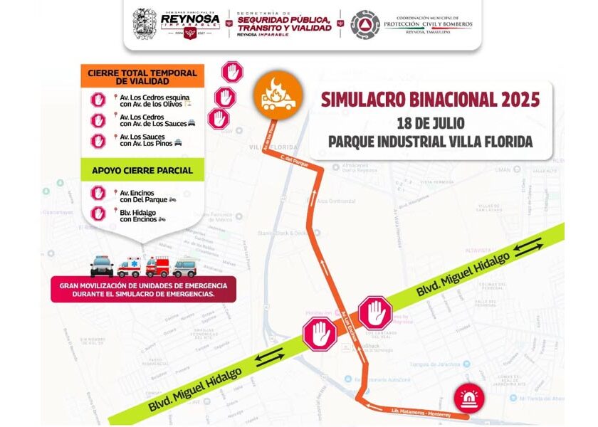 Reynosa, Tam.- El Gobierno Municipal de Reynosa informa que este viernes 18 de julio se realizará el Simulacro Binacional DINAPREQ 2025, con cierre total temporal de vialidad en Av. Los Cedros, esquina con Av. Los Olivos; Av. Los Cedros, esquina con Av. Los Sauces; Av. Los Sauces, esquina con Av. Los Pinos.Cierre parcial en: Av Encinos con Del Parque y…