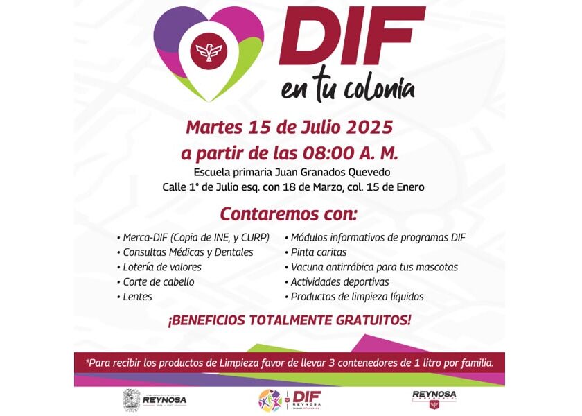 Reynosa, Tam.- Con el compromiso de acercar los programas y servicios de manera gratuita a las familias, el Sistema DIF-Reynosa, que preside Carlos Luis Peña Garza, realizará este martes 15 de julio, la brigada “DIF en Tu Colonia”, en la escuela Primaria “Juan Granados Quevedo”, ubicada en calle Primero de Julio esquina con 18 de Marzo, en la colonia 15…