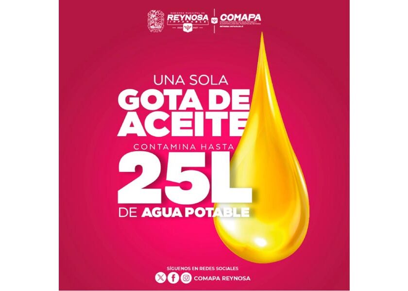 Reynosa, Tam.- La Comisión Municipal de Agua Potable y Alcantarillado hace un llamado a la ciudadanía a evitar arrojar aceite usado por el fregadero o en la vía pública, ya que esta práctica daña gravemente el medio ambiente, obstruye las tuberías y contamina nuestras fuentes de agua. Una sola gota de aceite puede contaminar hasta 25 litros de agua potable,…