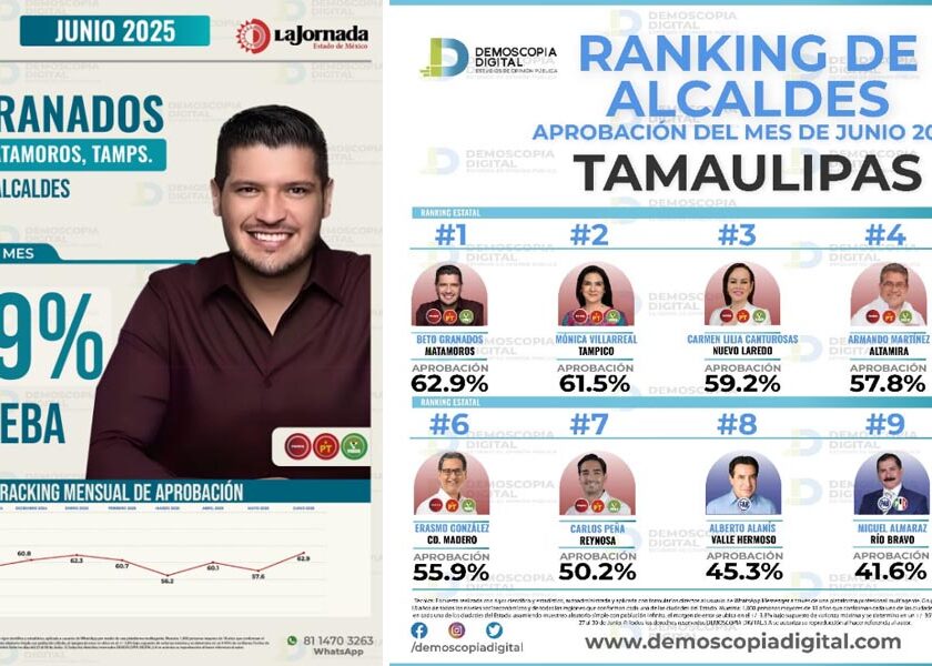 Matamoros, Tam.- En el más reciente estudio de la encuestadora Demoscopia, el alcalde de Matamoros Beto Granados, ocupa el 1er. lugar de aprobación ciudadana en el estado de Tamaulipas con un porcentaje de 62.9%. Por su parte, la encuestadora Datometría lo presenta en el 4to. lugar a nivel nacional con un 65.1% de aprobación. En solo 8 meses de su…