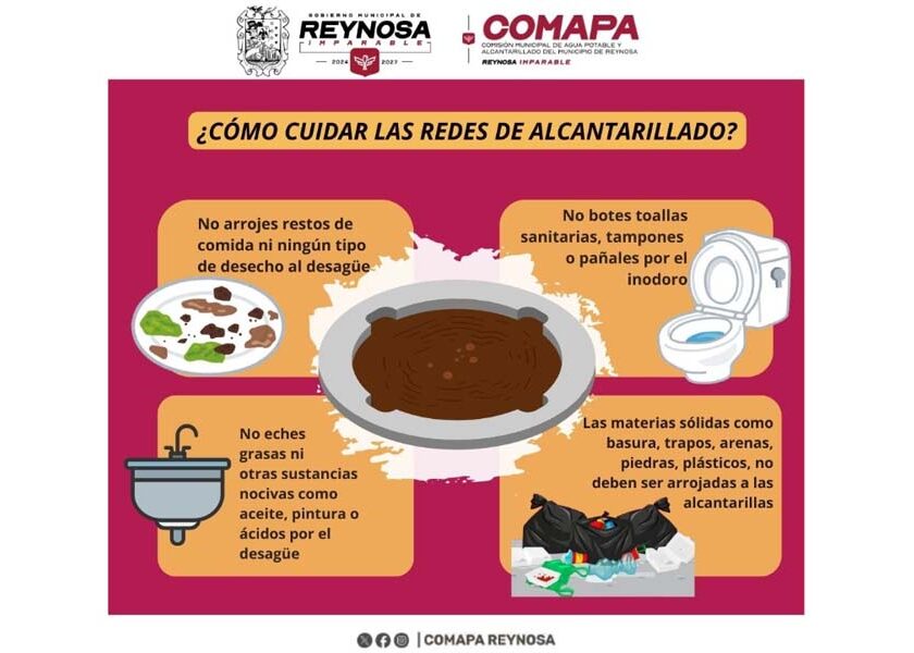 Reynosa, Tam.- La Comisión Municipal de Agua Potable y Alcantarillado de Reynosa hace un llamado a las y los usuarios para fortalecer el cuidado del sistema sanitario, recordando que su buen funcionamiento depende en gran medida de las acciones que se realizan dentro de cada hogar. Evitar malas prácticas en el uso del drenaje ayuda a prevenir taponamientos, fugas y…