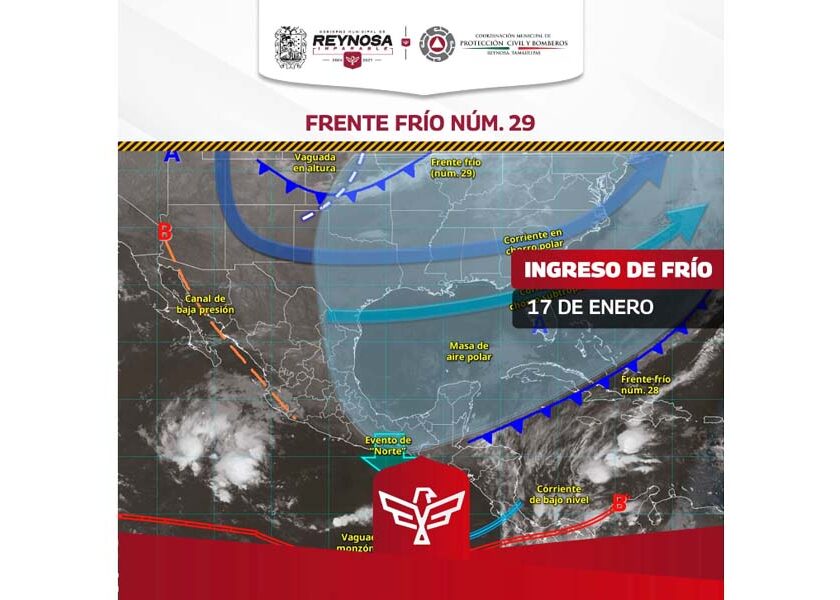 Reynosa, Tam.- El Gobierno Municipal de Reynosa informa que como efecto del Frente Frío Número 29, este sábado 17 de enero se podría registrar el descenso de la temperatura hasta entre 6° y 7° Centígrados, considerando que la máxima se situaría en 18°, con alta probabilidad de lluvia, de acuerdo a datos del Servicio Meteorológico Nacional. Similar temperatura cubriría a…