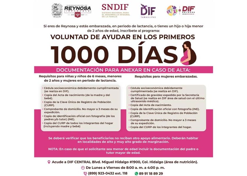 Reynosa, Tam.- El Sistema DIF- Reynosa que encabeza Carlos Luis Peña Garza, invita a la ciudadanía a registrarse al programa Voluntad de Ayudar en los Primeros 1000 Días, una estrategia orientada a fortalecer la salud y el desarrollo integral desde las primeras etapas de vida. Este programa está dirigido a mujeres embarazadas, en periodo de lactancia, así como niñas y…
