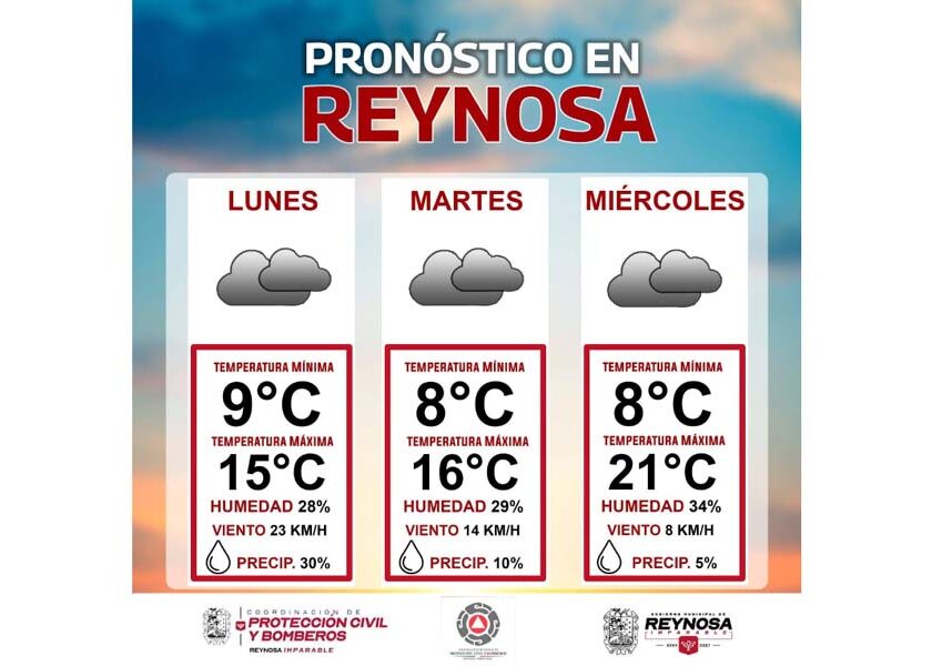 Reynosa, Tam.- La Coordinación de Protección Civil y Bomberos del Gobierno de Reynosa, informa que de acuerdo al Servicio Meteorológico Nacional, este martes 30 de diciembre se registrará un leve descenso en la temperatura ambiente, con la probabilidad de bajar a 8° Centígrados, con máxima de 16°. Y el miércoles 31 se esperan condiciones climáticas similares, 8° Centígrados como mínima…