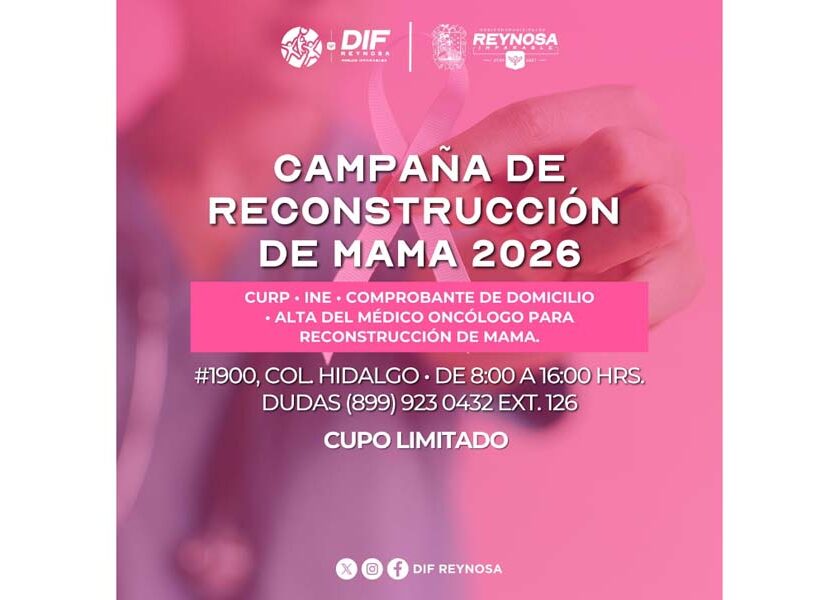 Reynosa, Tam.- El Sistema DIF-Reynosa que encabeza Carlos Luis Peña Garza, continúa con el registro de la Campaña de Reconstrucción de Mama 2026, dirigida a mujeres que han enfrentado y superado el cáncer de mama, en apoyo de una etapa fundamental de su recuperación, fortaleciendo su autoestima, seguridad y bienestar integral. La convocatoria está abierta para quienes cuenten con alta…