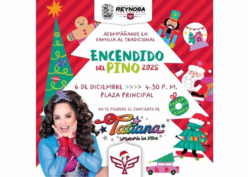 Reynosa, Tam.- El Presidente Municipal Carlos Peña Ortiz hace una invitación a todos los reynosenses para dar inicio a la temporada navideña con el tradicional Encendido del Pino 2025, y disfrutar del concierto de Tatiana, “La Reina de los Niños”. Este 6 de diciembre, a partir de las 4:30 de la tarde, en la plaza principal Miguel Hidalgo frente a…