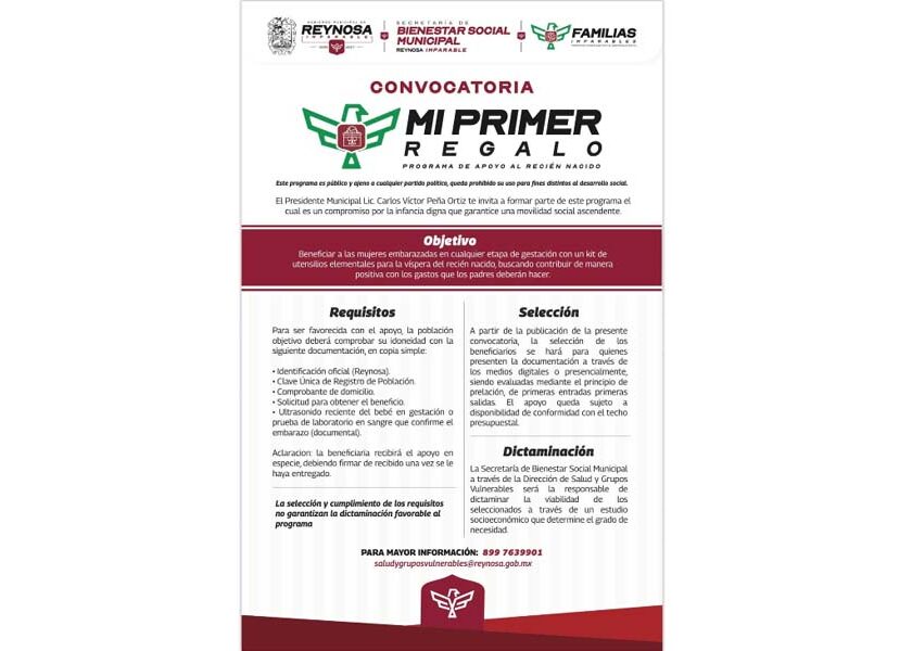 Reynosa, Tam.- El Alcalde Carlos Peña Ortiz invita a las mujeres embarazadas que residan en Reynosa, a inscribirse al programa municipal “Mi Primer Regalo”, y puedan recibir el beneficio social mediante el cumplimiento de sencillos requisitos. Este programa busca garantizar una movilidad social ascendente, a favor de mujeres embarazadas en cualquier etapa de gestación con un kit de utensilios elementales…