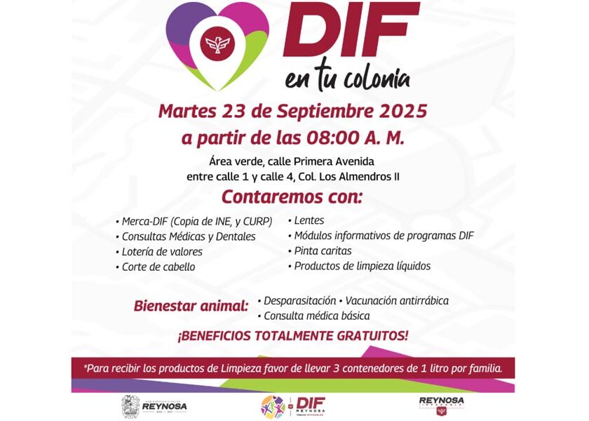 Reynosa, Tam.- El Sistema DIF Reynosa que preside Carlos Luis Peña Garza, invita a las familias a participar en la brigada “DIF en tu Colonia”, que se realizará el próximo martes 23 de septiembre a partir de las 8:00 de la mañana en el área verde ubicada en calle Primera Avenida, entre calle 1 y calle 4, de la colonia…