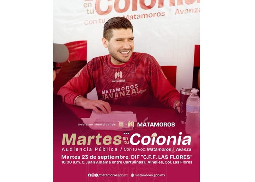 H. Matamoros, Tamaulipas.- El Gobierno de Matamoros que encabeza el alcalde Beto Granados invita a la ciudadanía a participar este martes 23 de septiembre en el encuentro comunitario que se realizará en la colonia Las Flores, con el propósito de escuchar propuestas y atender las necesidades de las familias. “Martes en tu colonia” se va a llevar a efecto en…