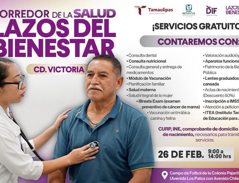 Ciudad Victoria, Tamaulipas.- El Gobierno del Estado y el Sistema DIF Tamaulipas, presidido por la doctora María de Villarreal, invitan a las familias victorenses al Segundo Corredor de la Salud “Lazos del Bienestar”, que se llevará a cabo el jueves 26 de febrero, a partir de las 9:00 de la mañana, en el campo de fútbol de la colonia Pajaritos,…