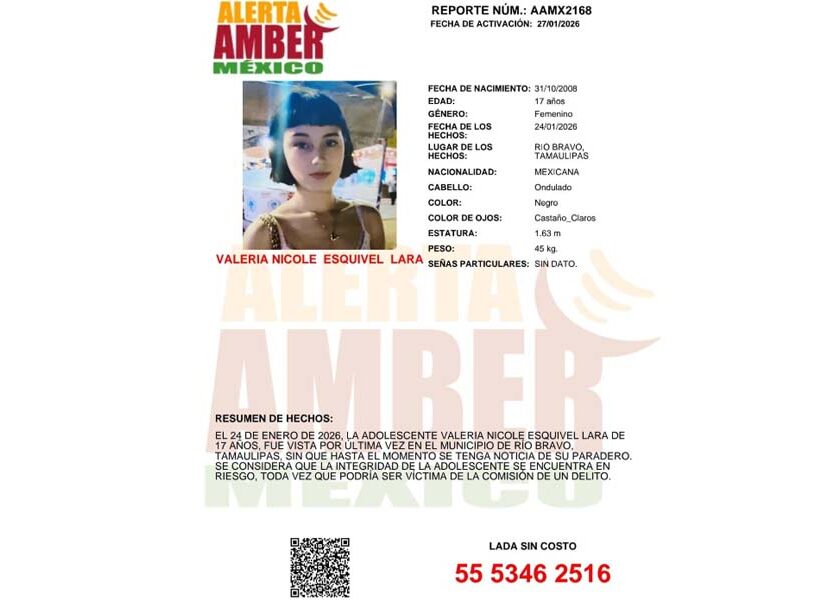 🚨 Se activa la #Alerta AMBER Nacional para la búsqueda de VALERIA NICOLE ESQUIVEL LARA, de 17 años de edad, desaparecida en Río Bravo, #Tamaulipas