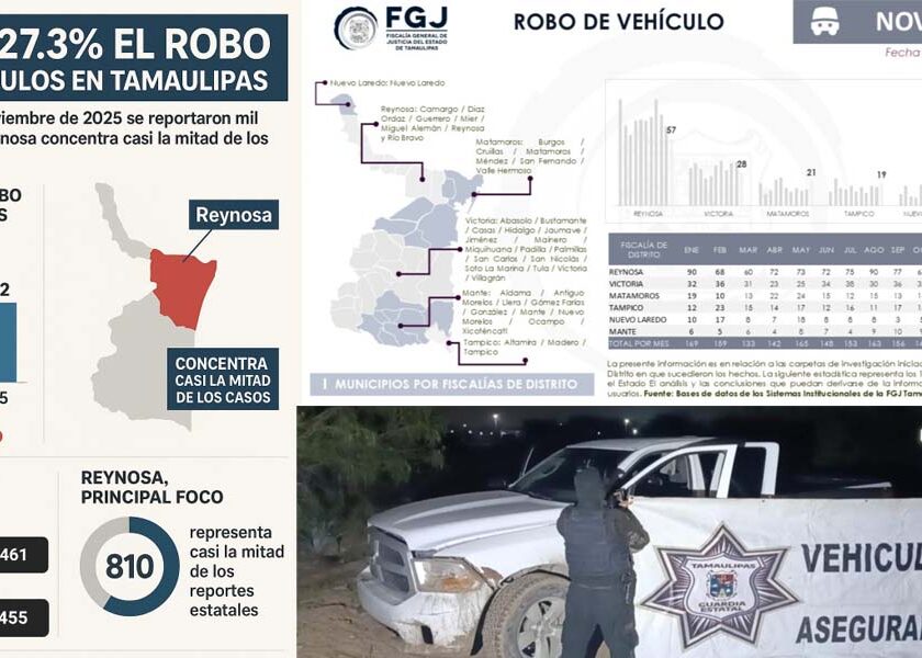 Por Julio Manuel Loya Guzmán.Cd. Victoria, Tamaulipas.- El robo de vehículos en Tamaulipas registró una disminución del 27.3% durante el periodo enero–noviembre de 2025, en comparación con el mismo lapso del año anterior; sin embargo, el delito continúa concentrándose en Reynosa, municipio que encabeza las estadísticas oficiales y se mantiene como el principal foco rojo. De acuerdo con informes de…