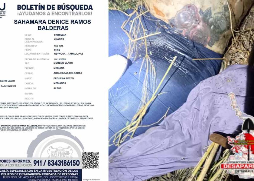 Por Julio Manuel Loya Guzmán.Cd. Victoria, Tamaulipas.- El cuerpo de una mujer en estado de descomposición fue localizado por el Colectivo Amor por los Desaparecidos en un predio despoblado de la zona oriente de Reynosa. La víctima fue identificada como Sahamara Denice Ramos Balderas, de 45 años, reportada como desaparecida desde el pasado 18 de noviembre. La líder del colectivo,…