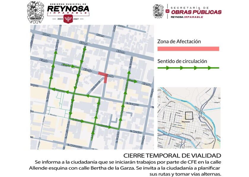 Reynosa, Tam.- El Gobierno Municipal de Reynosa informa a los conductores que hoy lunes 4 de agosto se hizo un cierre temporal de vialidad en la esquina de las calles Allende y Bertha Garza. El área es ocupada por personal de la Comisión Federal de Electricidad, que realiza maniobras propias de sus funciones y será liberada al término de su…