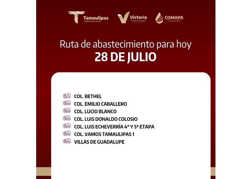 En COMAPA Victoria trabajamos para que el agua llegue a cada rincón de la ciudad. Este día, el servicio de abastecimiento se realiza en: