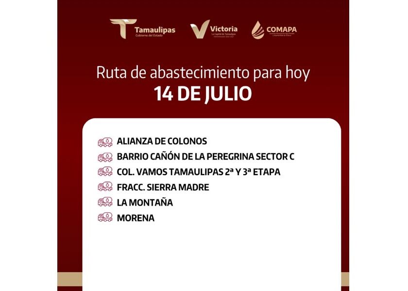 En COMAPA Victoria trabajamos para que el agua llegue a cada rincón de la ciudad. Este día, el servicio de abastecimiento se realiza en: 📍 Alianza de Colonos📍 Barrio Cañón de la Peregrina Sector C📍 Col. Vamos Tamaulipas 2ª y 3ª etapa📍 Fracc. Sierra Madre📍 La Montaña📍 Morena 💧 ¡Juntos hacemos que el agua llegue a todos! Comparte esta información…