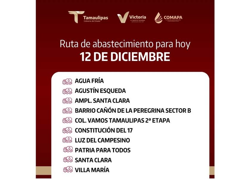 📍 Agua Fría📍 Agustín Esqueda📍 Ampl. Santa Clara📍 Barrio Cañón de la Peregrina Sector B📍 Col. Vamos Tamaulipas 2ª Etapa📍 Constitución del 17📍 Luz del Campesino📍 Patria Para Todos📍 Santa Clara📍 Villa María 💧 ¡Juntos hacemos que el agua llegue a todos! Comparte esta información con tus vecinos.