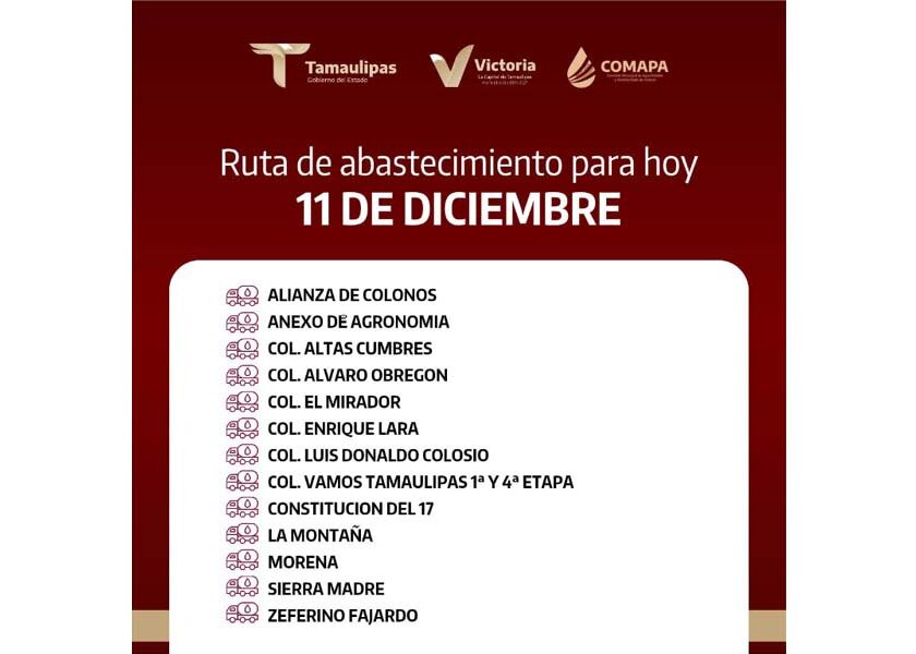En COMAPA Victoria trabajamos para que el agua llegue a cada rincón de la ciudad. Este día, el servicio de abastecimiento se realiza en: