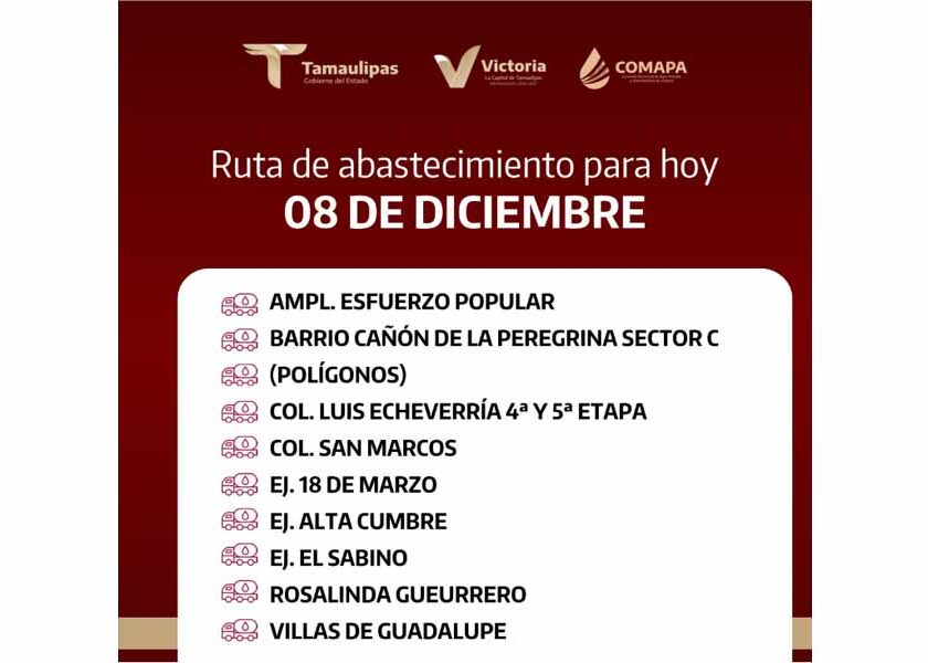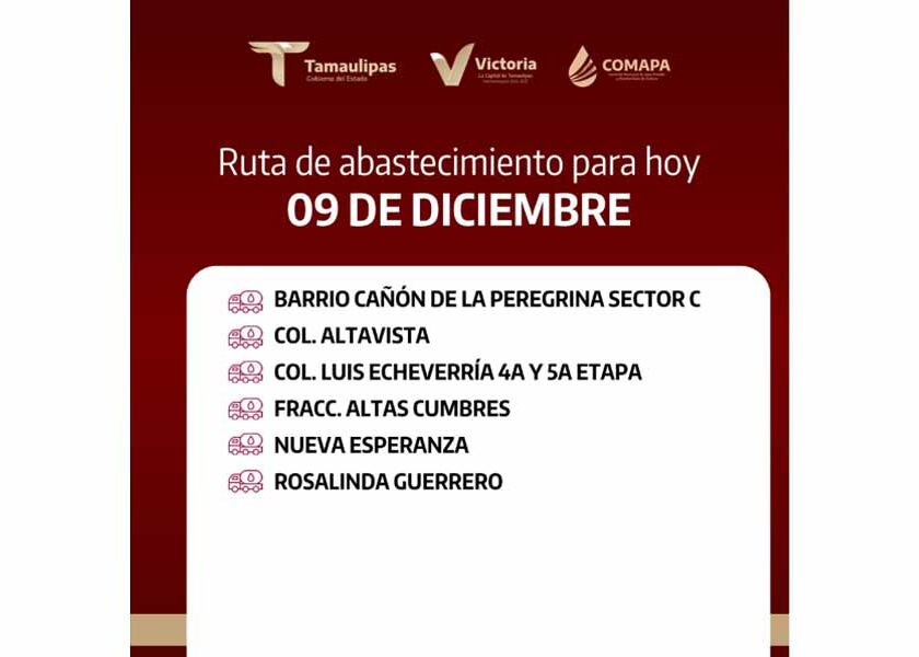 En COMAPA Victoria trabajamos para que el agua llegue a cada rincón de la ciudad. Este día, el servicio de abastecimiento se realiza en: