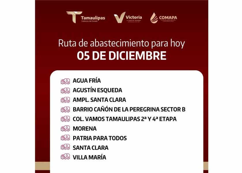 En COMAPA Victoria trabajamos para que el agua llegue a cada rincón de la ciudad. Este día, el servicio de abastecimiento se realiza en: