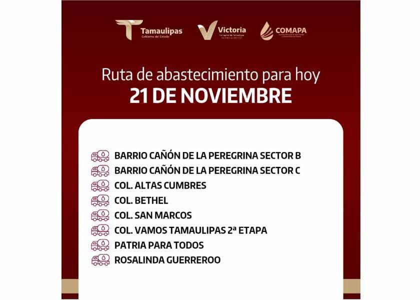 En COMAPA Victoria trabajamos para que el agua llegue a cada rincón de la ciudad. Este día, el servicio de abastecimiento se realiza en:
