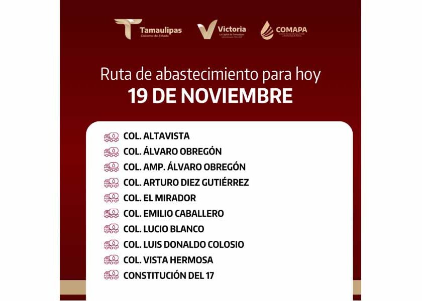 En COMAPA Victoria trabajamos para que el agua llegue a cada rincón de la ciudad. Este día, el servicio de abastecimiento se realiza en: