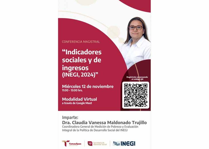 Ciudad Victoria, Tamps.- La videoconferencia magistral “Indicadores Sociales y de Ingresos (INEGI, 2024)”, será dictada por la Dra. Claudia Vanessa Maldonado Trujillo, coordinadora general de Medición de Pobreza y Evaluación Integral de la Política de Desarrollo Social del INEGI, el próximo miércoles 12 de noviembre, informó la secretaria de Bienestar Social Silvia Casas González. Dijo que esta conferencia está dirigida…
